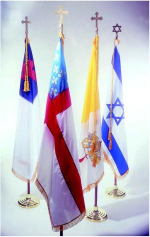The Crown Religious flag sets are furnished with the finest quality mountings. These mountings have unusual beauty which complements the finest decor. Each of our deluxe sets contains a highly polished two-piece oak-finish pole with our gold brass screw joint, appropriate top ornament, 9' golden yellow cord and tassels and The General stand. Sets come completely mounted in a specially designed mailing carton.
